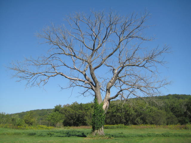 On the other hand, a tree that may have died on the outside, could have a hardened petrified heartwood and stand stronger than ever for many years. (see photo above)